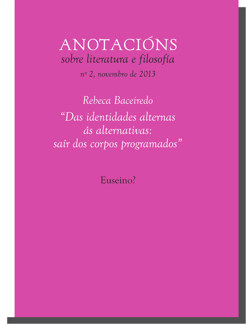 Euseino? Editores publica o número 2 de Anotacións sobre literatura e filosofía, desta volta cun ensaio de Rebeca Baceiredo sobre a cuestión do xénero no que a pensadora trata, entre outros temas, o réxime de norma heterosexual e as relacións de poder, as regresións contemporáneas das figuras de muller (a esposa e a puta) e a xestión da violencia, para rematar cunha proposta que a autora de A revolución non vai ser televisada sitúa “fóra dos corpos programados”.