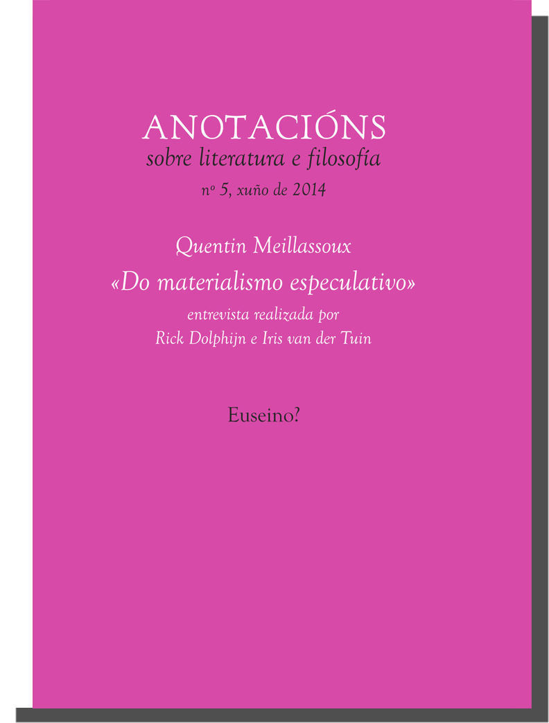 Neste novo número de Anotacións sobre literatura e filosofía (ISSN 2340-8537) publicamos unha entrevista con Quentin Meillassoux, realizada en 2011 para o libro New Materialism: Interviews & Cartographies, de Rick Dolphijn e Iris van der Tuin. Na entrevista, Meillassoux fai unha exposición sintética da súa obra: aínda que o adxectivo «especulativo» podería suxerir un retorno á filosofía precrítica, coa súa crenza dogmática no poder da razón pura, o materialismo especulativo non rexeita as achegas da filosofía crítica, pola contra, abrolla do recoñecemento das limitacións desta. Nese senso, a filosofía de Meillassoux pretende ir alén do xiro crítico e lingüístico realizado polo pensamento do século XX, tendo en conta o innegable progreso que supuxo o seu labor crítico mais recuperando o senso especulativo da filosofía no que esta ten de posibilidade de pensar o absoluto independentemente da posición do ser humano no mundo.