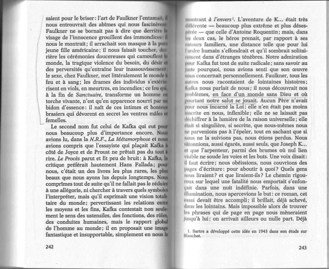 Sartre e mais eu estabamos sempre ao corrente das novidades. Dous nomes marcaron para nós o ano [1934]. Un deles foi o de Faulkner, de quen se publicaron case simultaneamente Tandis que j’agonise e Sanctuaire. Antes ca el, Joyce, Virginia Woolf, Hemingway e algúns outros rexeitaran a obxectividade falsa da novela realista para entregar o mundo a través das subxectividades; así e todo, a novidade e a eficacia da súa técnica deixáronnos abraiados; [Faulkner] non soamente orquestraba axeitadamente unha pluralidade de puntos de vista senón que en cada consciencia organizaba o saber, as ignorancias, a mala fe,, as pantasmas, as verbas, o silencio, de maneira que mergullaba os acontecementos nun claroscuro do que emerxían cun máximo de misterio e de relevo. Os seus relatos atinguíannos á vez pola súa arte e polos seus temas. En certo xeito, Tandis que j’agonise, esa epopea brutalmente picaresca, está emparentada coas invencións surrealistas […] Mais eses equívocos [surrealistas] tiñan na obra de Faulkner unha fondura materialista; se os obxectos e os usos se descubrían ao lector baixo aspectos chocantes é porque a miseria, a necesidade, ao cambiar a relación do ser humano coas cousas, fan mudar a face das cousas. É iso o que nos seduciu nesa novela que, para a nosa sorpresa, Valéry Larbaud definía no prefacio como “unha novela de costumes rurais”. Sanctuaire interesounos aínda máis. Non entenderamos a Freud, rexeitabámolo; mais desque nos presentaron as súas descubertas baixo unha forma para nós accesible, apaixonábamonos. Rexeitaramos os instrumentos que os psicanalistas nos propuxeran para rachar esa “indestrutible cerna de noite” que se encontra no corazón de todo ser humano: a arte de Faulkner fendíaa, entreabríanos abismos que nos fascinaron. Faulkner non se limitaba a dicir que detrás da cara da inocencia pululan as inmundicias: amosábanolo; arrincaba a súa máscara á moza americana pura; facíanos tocar, por tras das cerimonias acarameladas que camuflan o mundo, a violencia tráxica da necesidade, do desexo e das perversidades que carrexa a súa insatisfacción; o sexo, na obra de Faulkner, bota sangue e lume sobre o mundo; os dramas dos individuos exteriorízanse como violacións, como asasinatos, como incendios; ese lume que, no remate de Sanctuaire, transforma un home en facho vivente só aparentemente está alimentado por un bidón de gasolina: nace desas íntimas e vergoñentas lapas que devoran en segredo os ventres dos machos e das femias.