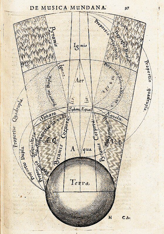 Segmento do macrocosmos amosando as esferas elementais da terra, aqua (auga), aer (aire), e ignis (lume), por Robert Fludd, 1617