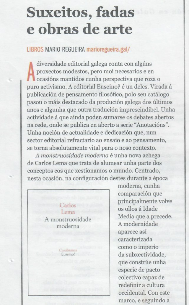 Na edición impresa do semanario Sermos Galiza con data 12-9-19, o crítico literario, poeta e narrador Mario Regueira escribe unha recensión da Monstruosidade moderna, o libro de Carlos Lema recentemente publicado na colección Casabranca. O artigo comeza dedicándolle unhas liñas ao labor editorial de Euseino? para centrarse logo na análise da obra.