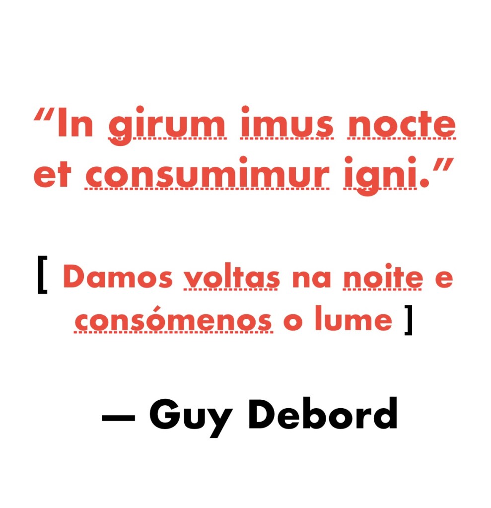Ao tempo que facemos a primeira publicación da serie Anónima, tamén collemos o título da derradeira película de Guy Debord, “In girum imus nocte et consumimur igni”, como motivo para estimular a reflexión verbo da cultura como espectáculo. O título do filme de Debord é unha forma abreviada do hexámetro dactílico e palíndromo “In girum imus nocte ecce et consumimur igni”, locución latina cuxa orixe é antiga e incerta. Podería facer referencia ás avelaíñas que viran arredor dunha candea antes de queimarse nela e significa: «Damos voltas na noite e consómenos o lume».