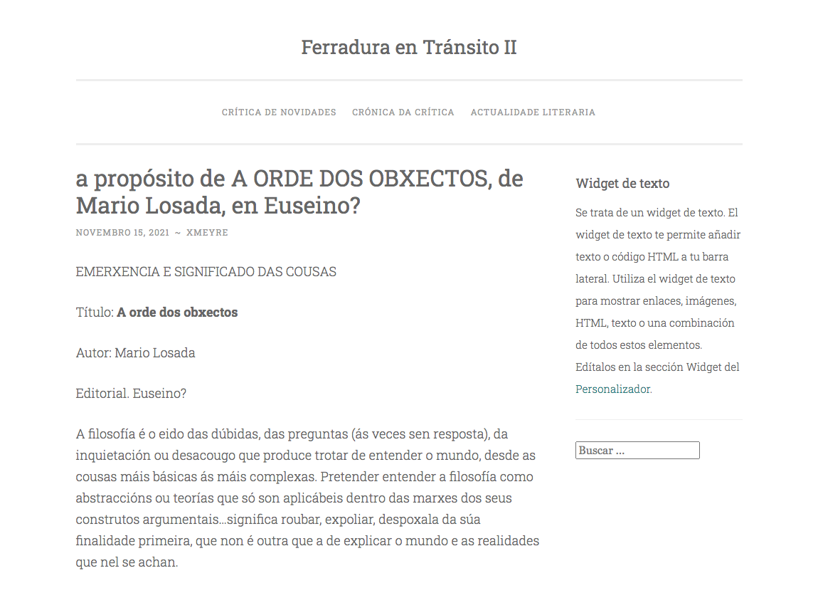 A propósito de A orde dos obxectos, por Xosé M. Eyré, en Ferradura en Tránsito II, 15 de novembro de 2021.