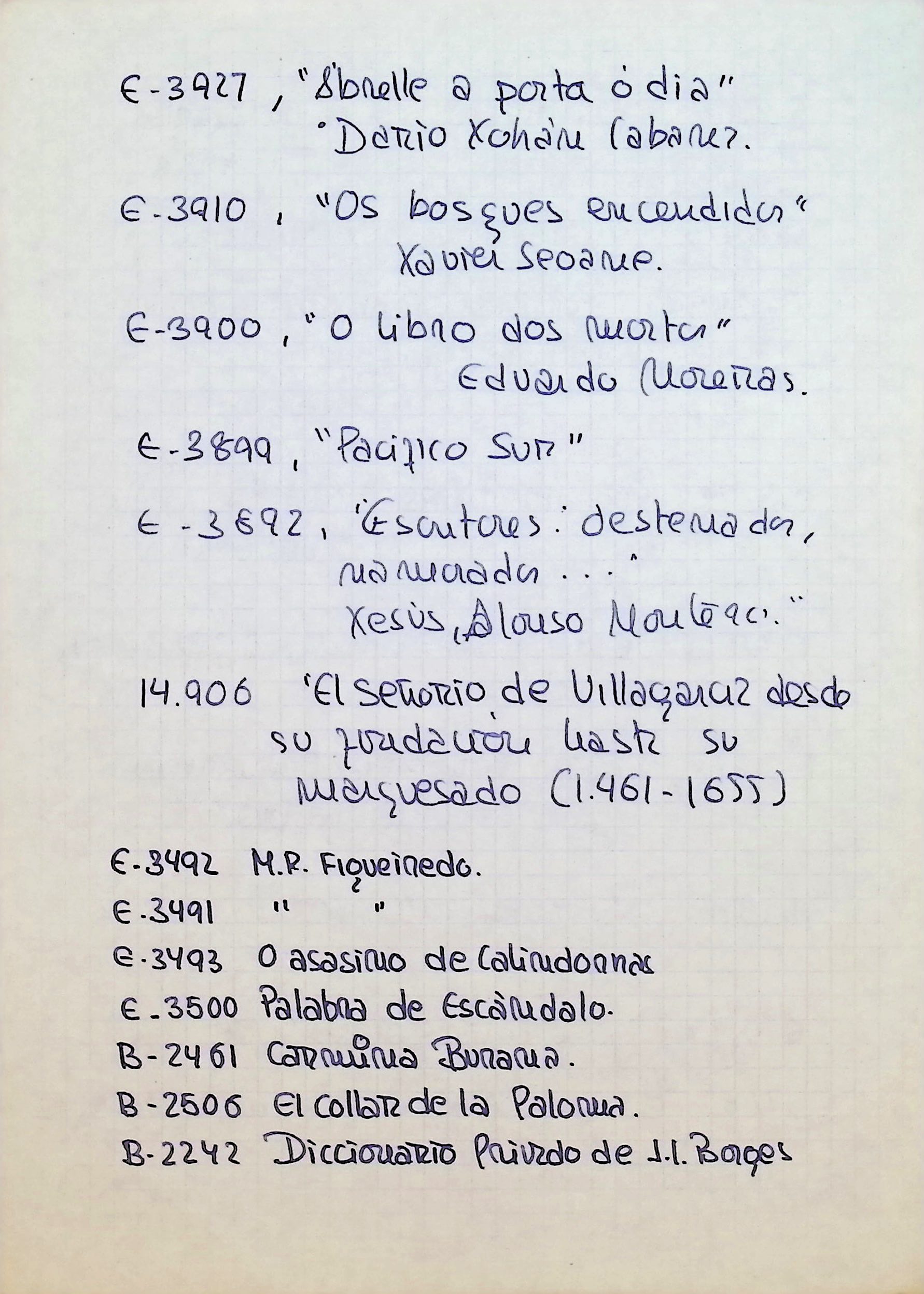 Nas listas os seguintes títulos: “Unha única duna e nós entre elas”; “Tres días de marzo”; “As hortensias de Aloth”; “Chegará o vran xa verás, Inés”; “Os namorados de Claudia”; “Adriano e o recendo dos limóns”; “Mais non quixo toca-lo violín”; “E no medio un cóctel de champán”; “O fillo (maternidade)”; “A caixa dos caraveis murchos”; “Cantar para unha nai morta”.
