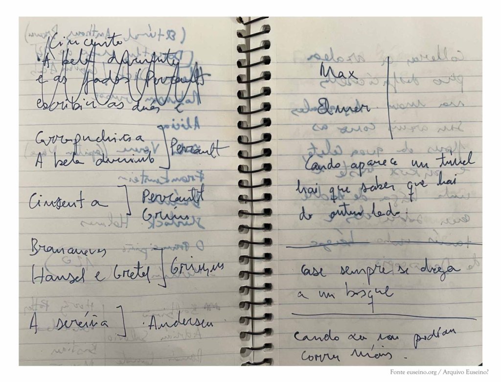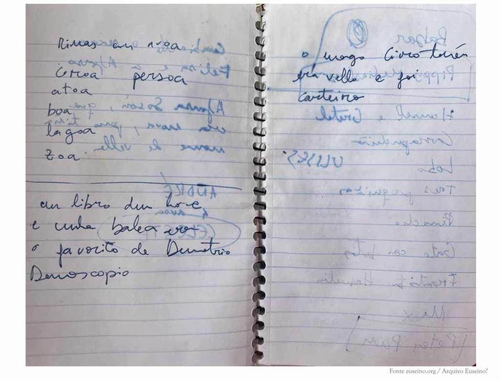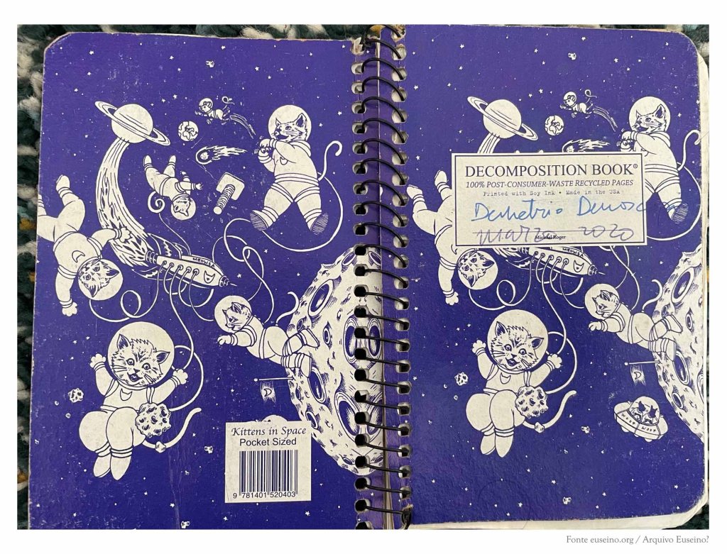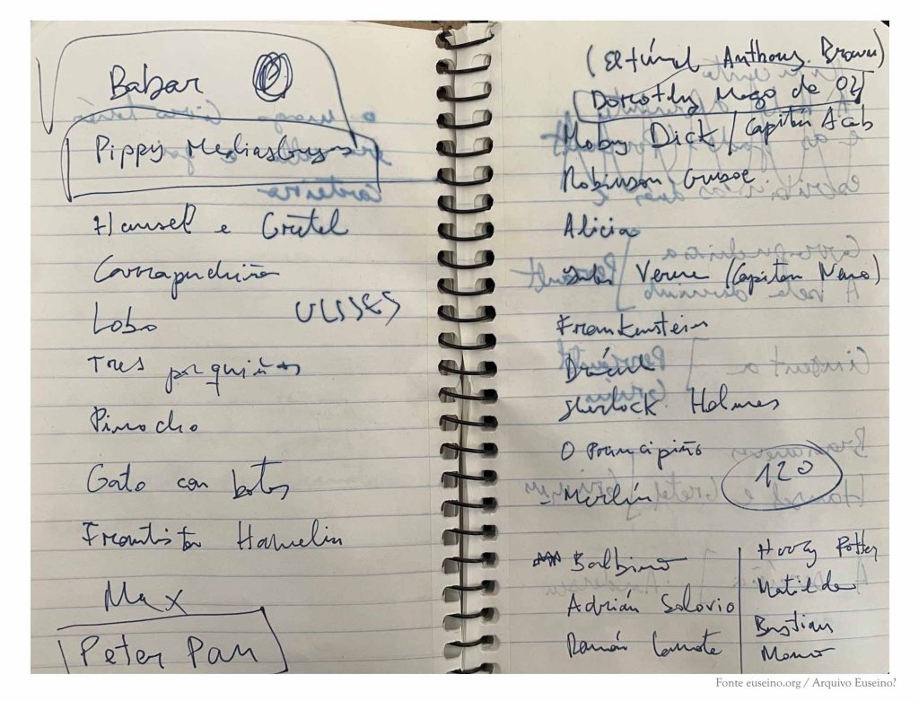 As primeiras páxinas deste caderno recollen os apuntamentos que corresponden a unha reescritura da obra de literatura infantil Demetrio Demoscopio perdeu a chispa (Edicións Xerais, 2022). Tamén figura unha lista de poemas breves que finalmente desapareceron do libro, algunhas ideas rápidas sobre posibles cambios para a versión final, unha recompilación de nomes de personaxes de contos clásicos que poderían sumarse a outros que aparecen no libro e, no envés dunha das páxinas, o bosquexo dun pequeno calendario de traballo.