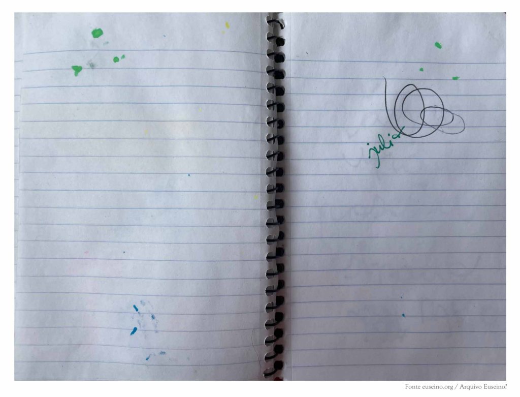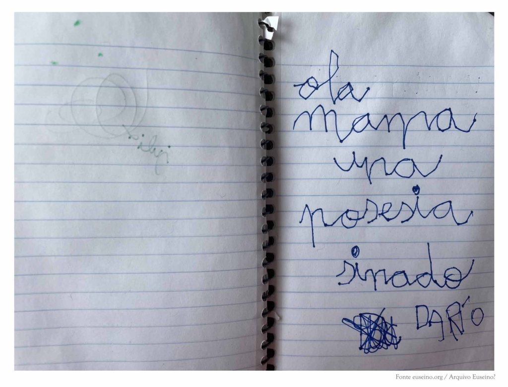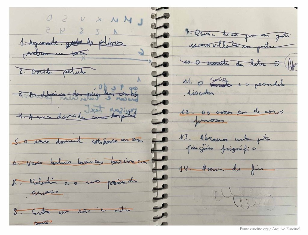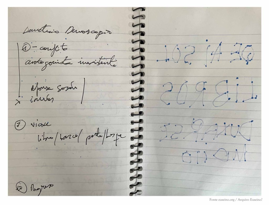 As primeiras páxinas deste caderno recollen os apuntamentos que corresponden a unha reescritura da obra de literatura infantil Demetrio Demoscopio perdeu a chispa (Edicións Xerais, 2022). Tamén figura unha lista de poemas breves que finalmente desapareceron do libro, algunhas ideas rápidas sobre posibles cambios para a versión final, unha recompilación de nomes de personaxes de contos clásicos que poderían sumarse a outros que aparecen no libro e, no envés dunha das páxinas, o bosquexo dun pequeno calendario de traballo.