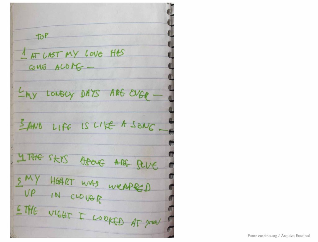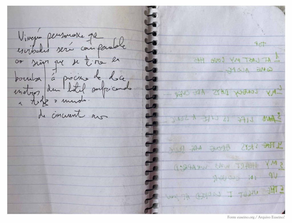 De seguido, o caderno ten unha nota que corresponde a unha primeira versión de Os seres queridos (Edicións Xerais, 2021), na que se alude ao nome dos personaxes iniciais da novela e á canción At Last, composta por Harry Warren e Mack Gordon para o musical Sun Valley Serenade (1941), canción que daba título a algún dos capítulos desa versión da novela e que aparece nalgunha das páxinas anteriores deste caderno.