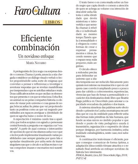 “Encantoume esta proposta de álbum ilustrado: Lica de Beatriz Fraga está publicado por Euseino? Editores. A orixinalidade é total: é unha historia contada con figuras xeométricas e cores básicas. Realmente, é un pracer para os sentidos pasar cada páxina e sorprenderse con cada nova forma proposta, unha forma que convida a descubrir figuras fuxindo de estereotipos. Un xeito de achegar ao lectorado máis novo a arte contemporánea, a linguaxe artística. Un pracer descubrir quen é a protagonista final a base de emocións visuais e tamén, claro está, conceptuais.”