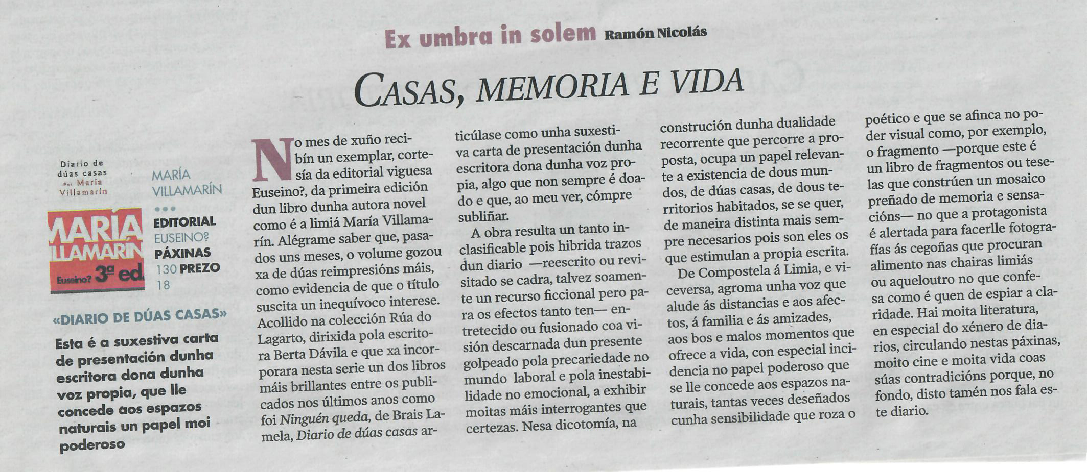 María Villamarín configura nestas páxinas unha obra narrativa singular e única, a fundación dunha escritura xenuína e evocadora, cristalina e profunda, onde casa e caderno poden ser a mesma cousa, tan real e tan presente para quen escribe como para quen le.