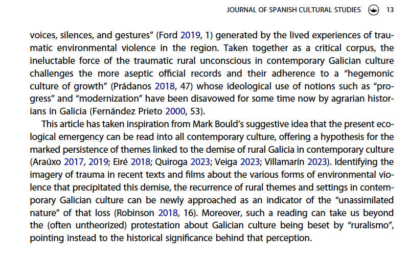 “The traumatic rural unconscious in contemporary Galician culture: hydropolitical violence in literature and film “, por Helena Miguélez-Carballeira, Journal of Spanish Cultural Studies , 18 de novembro de 2024. <https://doi.org/10.1080/14636204.2024.2421449>