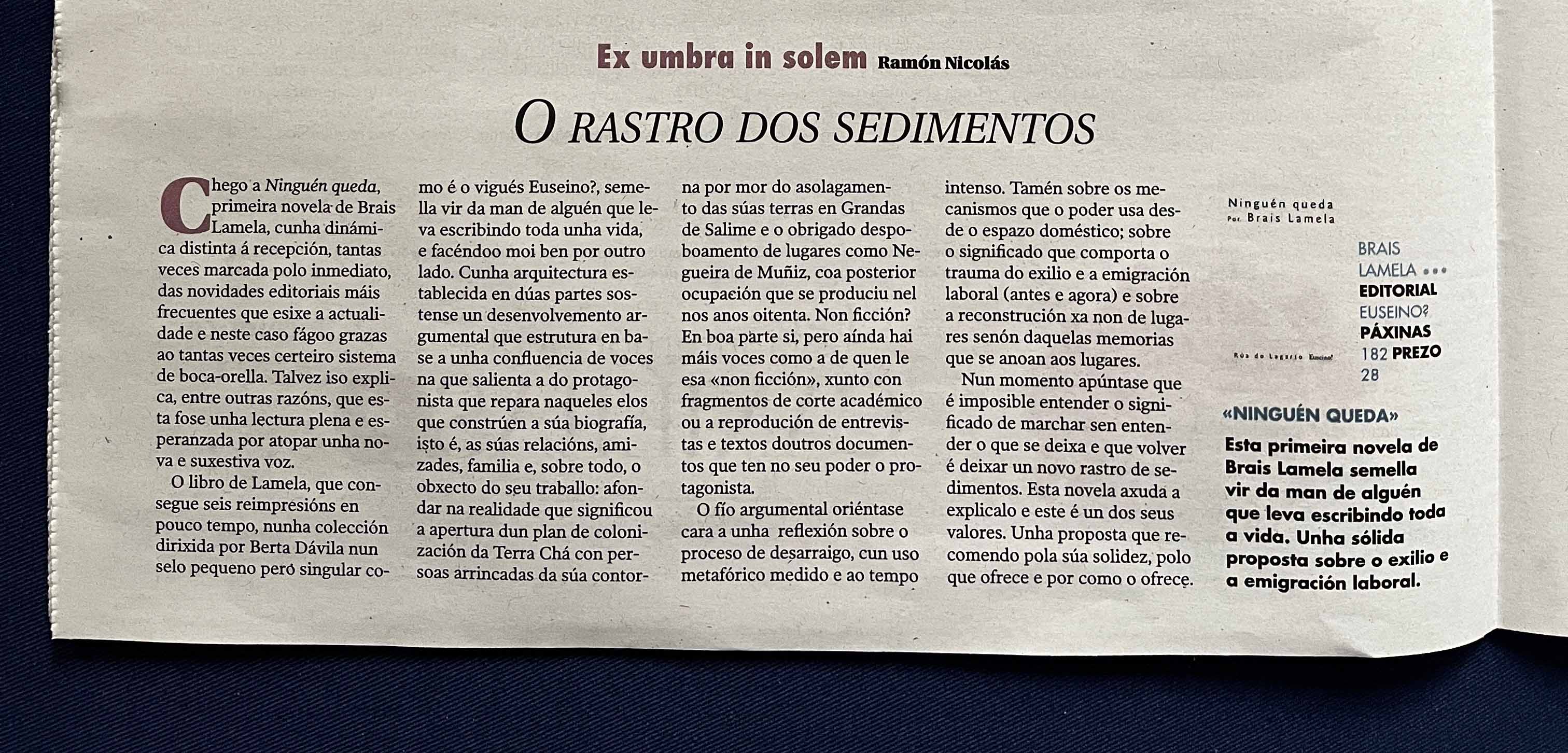 O rastro dos sedimentos, por Ramón Nicolás, Fugas, La Voz de Galicia, 13-I-2023. Tamén en Caderno da Crítica.