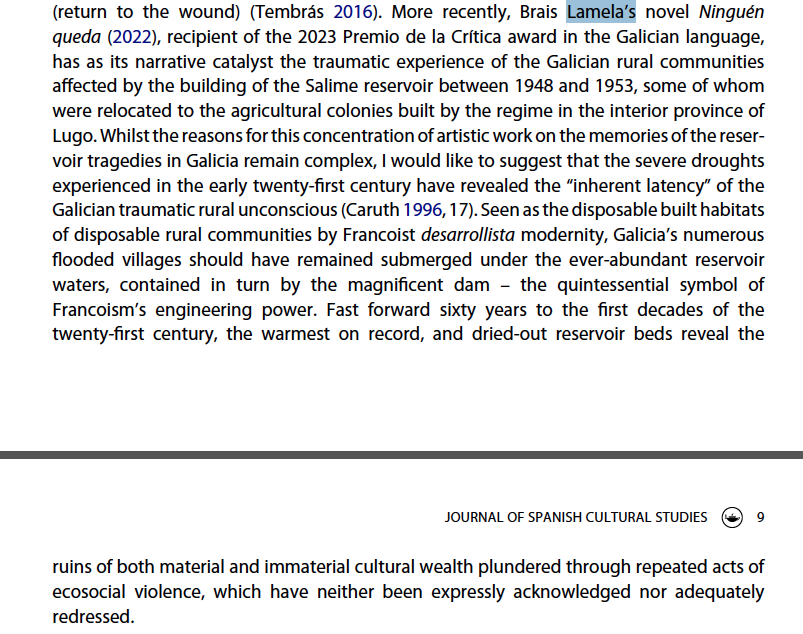 “The traumatic rural unconscious in contemporary Galician culture: hydropolitical violence in literature and film “, por Helena Miguélez-Carballeira, Journal of Spanish Cultural Studies , 18 de novembro de 2024. <https://doi.org/10.1080/14636204.2024.2421449>