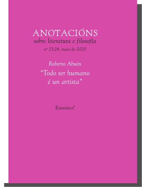 O ensaio de Roberto Abuín que incluímos neste número duplo de Anotacións sobre literatura e filosofía é, como demostración dunha posibilidade aberta e factible, un paso importante no desenvolvemento dun ámbito de pensamento autónomo, no que pensadoras e pensadores galegos, escritoras, poetas e narradores poidan encontrar unha recepción acaída da súa obra, un esforzo interpretativo sobre o seu alcance e necesidade e unha plataforma de proxección no medio social no que escriben.